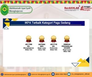 Capaian ini menegaskan konsistensi Mahkamah Syar’iyah Blangkejeren yang berhasil mempertahankan prestasi selama tiga triwulan berturut-turut, menunjukkan komitmen yang kuat dalam menjaga integritas dan profesionalisme pengelolaan keuangan negara di lingkungan peradilan. Dalam capaian kali ini, Mahkamah Syar’iyah Blangkejeren memperoleh dua penghargaan sekaligus, yaitu: IKPA Terbaik Kategori Pagu s.d. 2,5 Miliar (DIPA 04 Mahkamah Syar’iyah Blangkejeren – 401710), dan IKPA Terbaik Kategori Pagu Di atas 2,5 Miliar s.d. 5 Miliar (DIPA 01 Mahkamah Syar’iyah Blangkejeren – 401709).