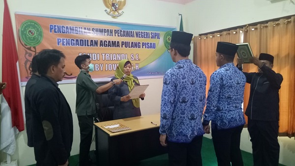 Ketua pengadilan Agama Pulang Pisau, Sri Roslinda, S.Ag.,M.H. memimpin langsung prosesi yang pesertanya dibatasi secara fisik tersebut. Selain itu turut serta hadir Wakil Ketua, Hakim, Sekretaris, panitera dan beberapa orang unsur pimpinan lainnya. Kemudian yang terpenting 1 orang CPNS dan 1 orang CPNS lainya terhubung menggunakan aplikasi video conference, beserta dua orang saksi dan satu orang rohaniawan. Beliau berharap dengan proses seperti ini tidak mengurangi kekhidmatan acara itu sendiri.