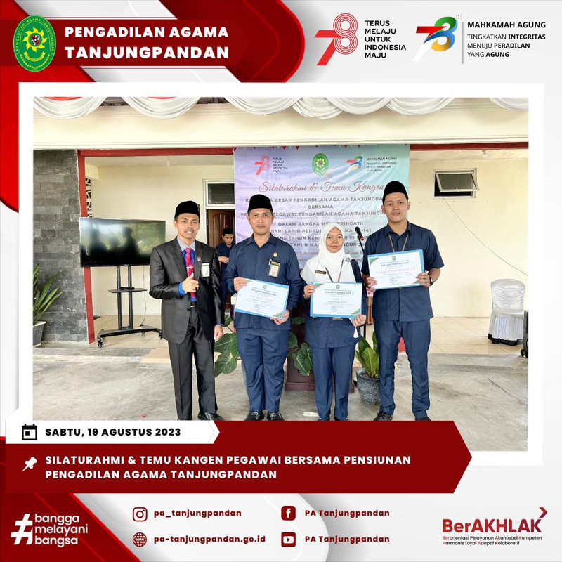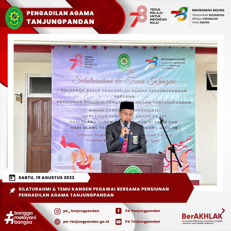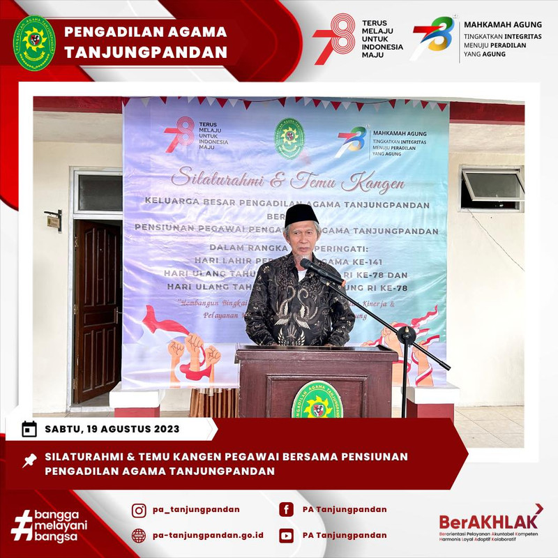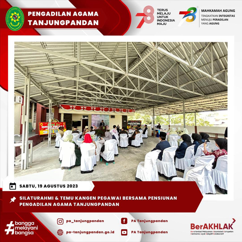 Tanjungpandan, 19 Agustus merupakan hari bersejarah bagi Aparatur Peradilan di seluruh Indonesia. Mahkamah Agung RI dibentuk pada tanggal 19 Agustus 1945 tepatnya 2 hari setelah Kemerdekaan Republik Indonesia di Proklamirkan. Pada tahun 2023 ini Mahkamah Agung RI telah berusia 78 tahun sejak dibentuk. Aparatur Peradilan bersuka cita menyambut Hari Ulang Tahun Mahkamah Agung dengan mengadakan berbagai macam kegiatan, misalnya Upacara, Kegiatan Olahraga, Acara Hiburan, Kegiatan Sosial dan Keagamaan. Begitu juga halnya dengan Pengadilan Agama Tanjungpandan, di Hari Ulang Tahun ke- 78 Mahkamah Agung RI kali ini juga ikut memperingati dan merayakannya. Tahun ini Pengadilan Agama melaksanakan kegiatan yang sedikit berbeda dari tahun-tahun sebelumnya yaitu dengan mengikutsertakan para pensiunan dan keluarga pensiunan pegawai Pengadilan Agama Tanjungpandan yang saat ini masih berdomisili di Kota Tanjungpandan.