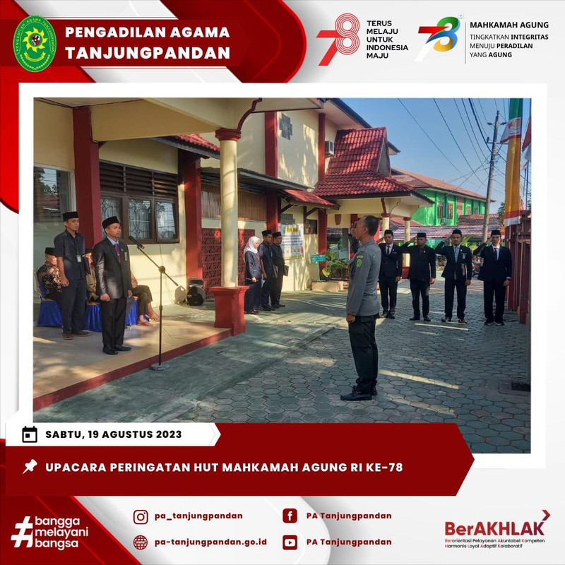 Peringatan Hari Ulang Tahun ke- 78 Mahkamah Agung RI pada Pengadilan Agama Tanjungpandan diawali dengan Upacara Bendera yang dimulai pada pukul 08.00 WIB bertempat di halaman Kantor Pengadilan Agama Tanjungpandan. Upacara Bendera dipimpin oleh Badrudin, S.HI. (Wakil Ketua PA Tanjunpandan) selaku Pembina Upacara. Kegiatan upacara ini selain diikuti oleh seluruh Pegawai PA Tanjungpandan juga diikuti oleh Dharmayukti Karini PA Tanjungpandan, Mahasiswa PKL serta Para Pensiunan Pegawai PA Tanjungpandan. Upacara berlangsung tertib dan khidmat dengan susunan acara yang telah ditentukan. Dalam amanat pembinan Upacara, Wakil Ketua PA Tanjungpandan membacakan amanat Ketua Mahkamah Agung RI. Dalam amanat yang dibacakan, Ketua Mahkamah Agung RI menyampaikan pesan kepada Aparatur Peradilan di seluruh Indonesia untuk mengembalikan kepercayaan masyarakat terhadap Lembaga Peradilan setelah beberapa waktu yang lalu terjadi hal-hal yang telah menurunkan citra Lembaga Peradilan. Oleh karena itu melalui Tema Tingkatkan Integritas Menuju Badan Peradilan Yang Agung Ketua Mahkamah Agung mengingatkan kembali tentang pentingnya Integritas kepada seluruh Apartur Peradilan. Selain itu dalam amanat yang dibacakan disampaikan pula prestasi-prestasi yang telah diraih Mahkamah Agung selama tahun 2023 dan inovasi-inovasi baru yang telah dikembangkan yang tujuannya tidak lain dan tidak bukan untuk meningkatkan kinerja organisasi dan kualitas pelayanan kepada masyarakat.