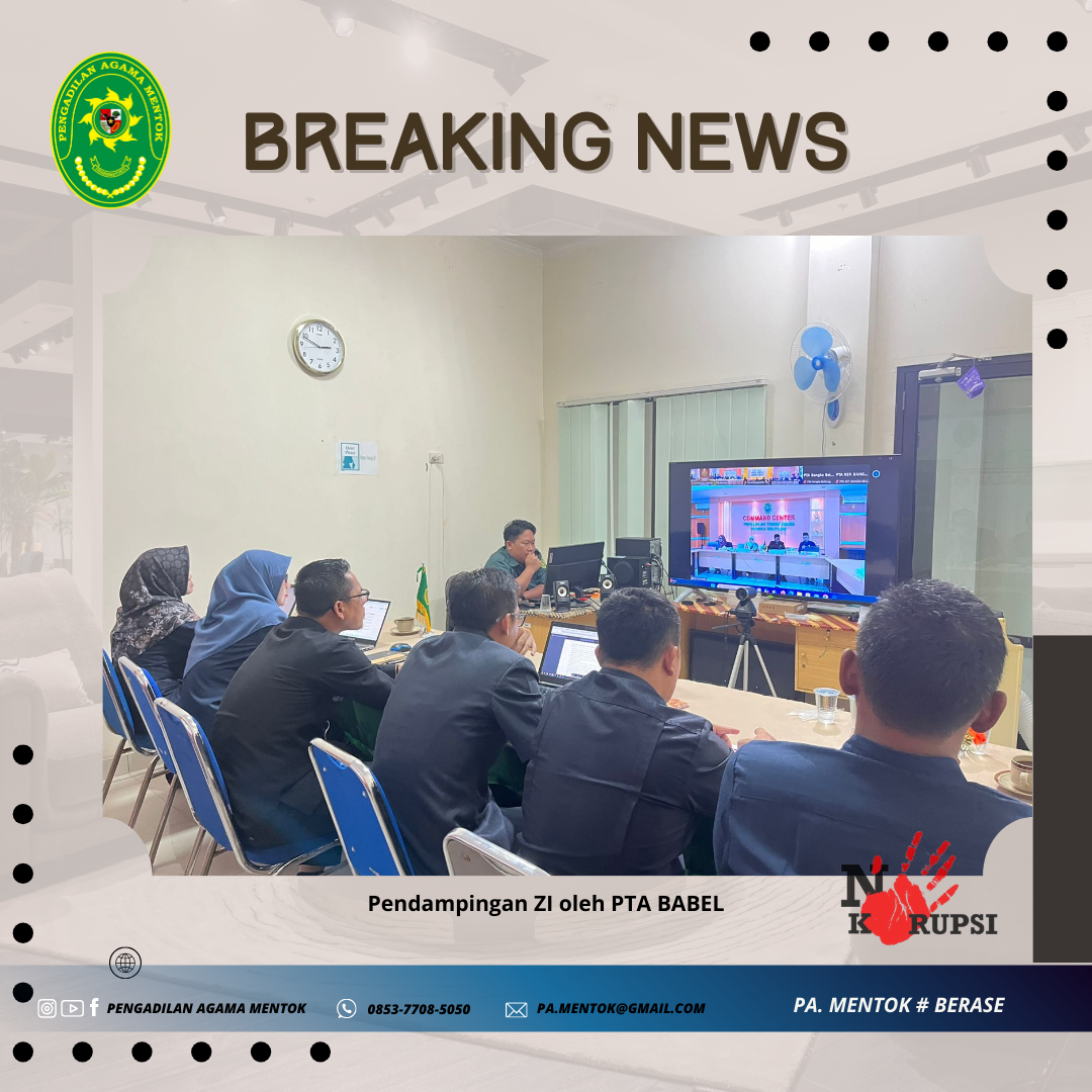 www.pa.mentok.go.id. Mentok, 17 Desember 2024 – Ketua Pengadilan Agama Mentok, Hermanto, S.H.I., M.E, bersama Ketua Zona Integritas (ZI) Pengadilan Agama Mentok, Ibu Komariah, S.H.I., M.E, serta Koordinator dan anggota Area I dan Area II ZI, mengikuti kegiatan pendampingan Zona Integritas yang diselenggarakan oleh Pengadilan Tinggi Agama Kepulauan Bangka Belitung secara daring. Kegiatan ini juga diikuti oleh Pengadilan Agama Pangkalpinang, Pengadilan Agama Sungailiat, serta Pengadilan Agama Tanjung Pandan.