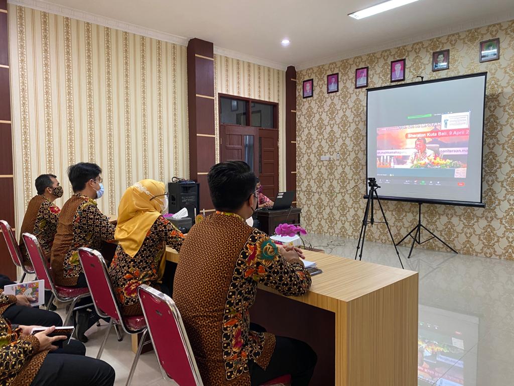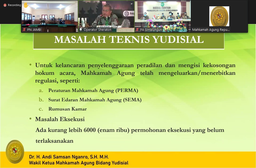Simalungun, Jumat 9 April 2021. Bertempat di ruang media center, Ketua, Wakil Ketua, Hakim, Panitera dan Sekretaris Pengadilan Agama Simalungun megikuti kegiatan pembinaan bidang teknis dan administrasi yudisial oleh Ketua Mahkamah Agung secara virtual. Kegiatan ini diikuti oleh seluruh pengadilan 4 lingkungan peradilan di Indonesia.