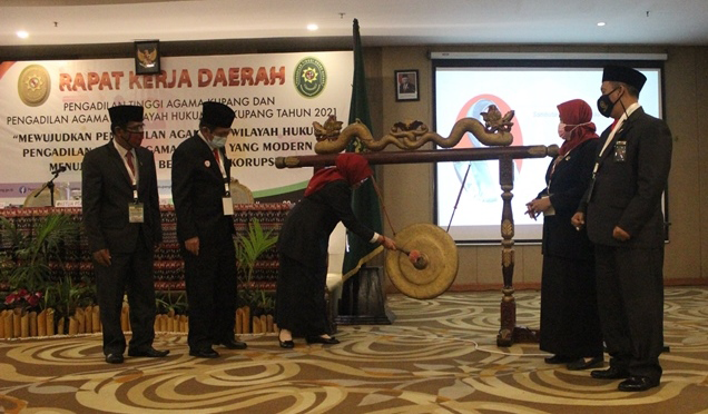 Senin, 29 Maret 2021, ditandai dengan pukulan gong, Ketua Pengadilan Tinggi Agama Kupang, Dra. Hj. Sisva Yetti, S.H., M.H., membuka secara resmi kegiatan Rapat Kerja Daerah Pengadilan Tinggi Agama Kupang dan Pengadilan Agama Sewilayah Pengadilan Tinggi Agama Kupang yang berlangsung di Hotel Swiss Belinn Kupang. Kegiatan Rakerja Daerah yang merupakan agenda tetap setiap tahun itu direncanakan berlangsung selama 3 hari, sampai dengan 31 Maret 2021.